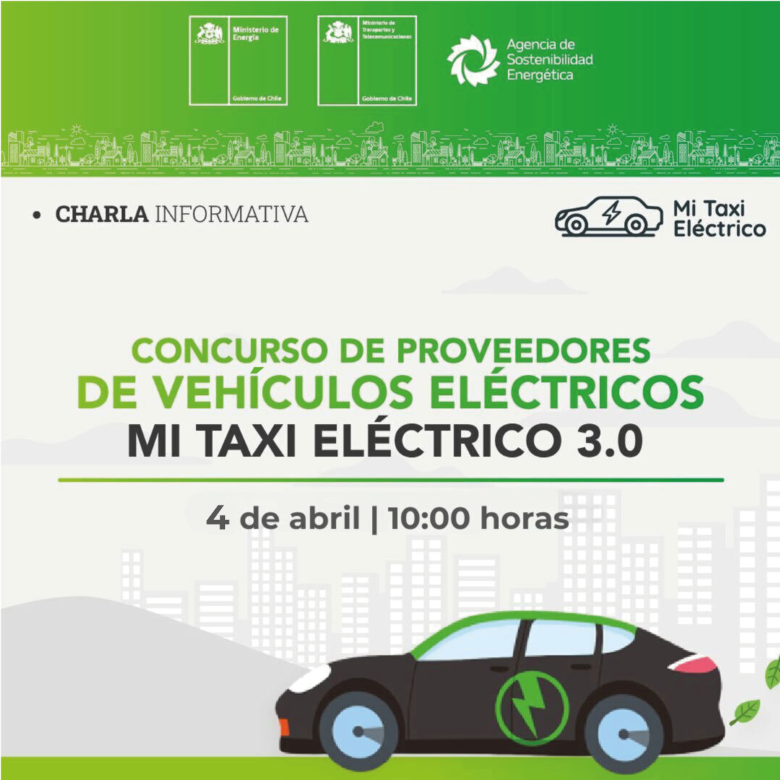Agencia de Sostenibilidad Energética (AgenciaSE) realizará una charla informativa sobre las bases del concurso para proveedores de vehículos eléctricos para el programa Mi Taxi Eléctrico (MTE) 3.0, el jueves 4 de abril de 2024, a las 10:00 horas, en la Asociación Nacional Automotriz de Chile A.G. (ANAC), en formato presencial/virtual.