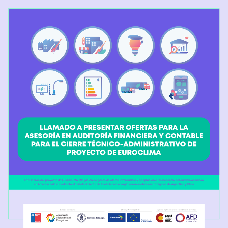 La Secretaría de Energía del Ministerio de Economía de Argentina, el Ministerio de Energía de Chile y la Agencia de Sostenibilidad Energética (AgenciaSE) invitan a presentar ofertas para prestar el servicio de asesoría en auditoria financiera y contable para el cierre técnico-administrativo del proyecto de EUROCLIMA “Mitigación de gases efecto invernadero y adaptación a los impactos del cambio climático en América Latina mediante el fortalecimiento de la eficiencia energética en sectores estratégicos de Argentina y Chile”, que es implementado por el sector Eficiencia Energética de este programa, a través de la Agencia Española de Cooperación Internacional para el Desarrollo (AECID) y la Agencia Francesa de Desarrollo (AFD).