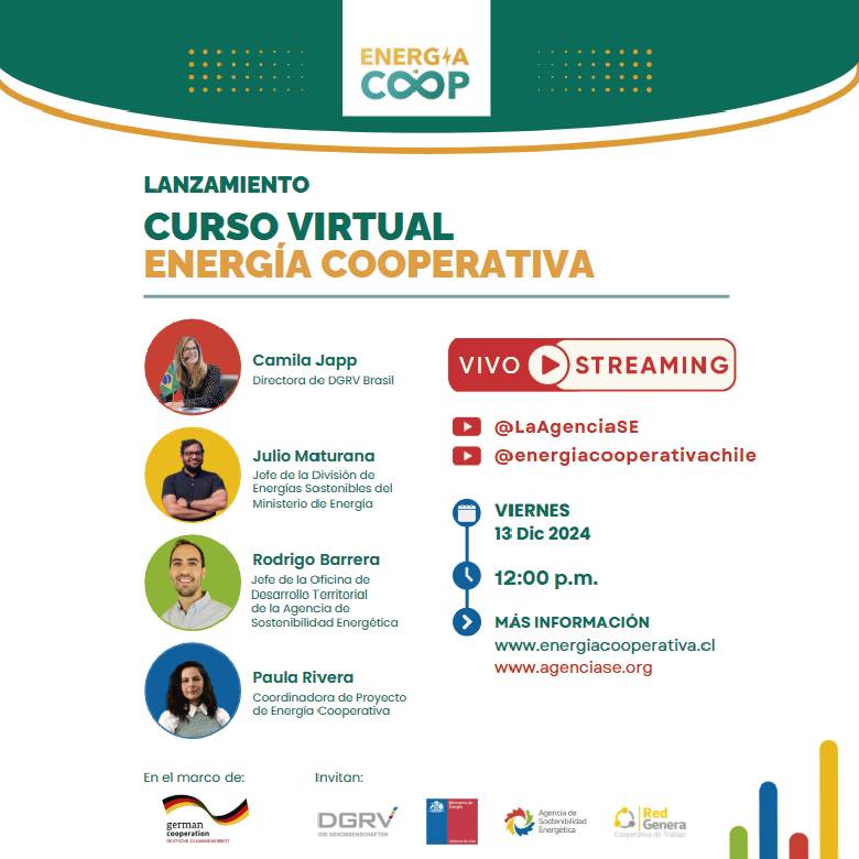 El Ministerio de Energía, la Agencia de Sostenibilidad Energética, la Confederación Alemana de Cooperativas (DGRV) y Red Genera en el marco del proyecto Energía Cooperativa, le invitan cordialmente a participar del “Curso Virtual Energía Cooperativa“, que se realizará este viernes 13 de diciembre, a las 12:00 horas, a través del canal de YouTube de la AgenciaSE.