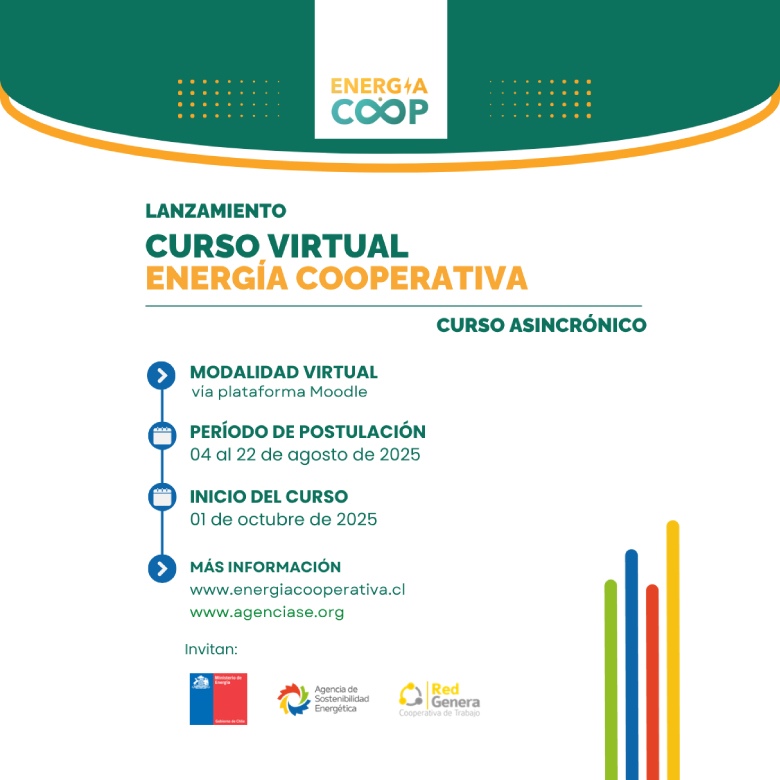 El Ministerio de Energía, la Agencia de Sostenibilidad Energética y Red Genera invitan cordialmente a postular a la segunda versión del Curso Virtual Energía Cooperativa, que busca fortalecer las capacidades locales para el desarrollo de proyectos de generación distribuida con participación comunitaria.
