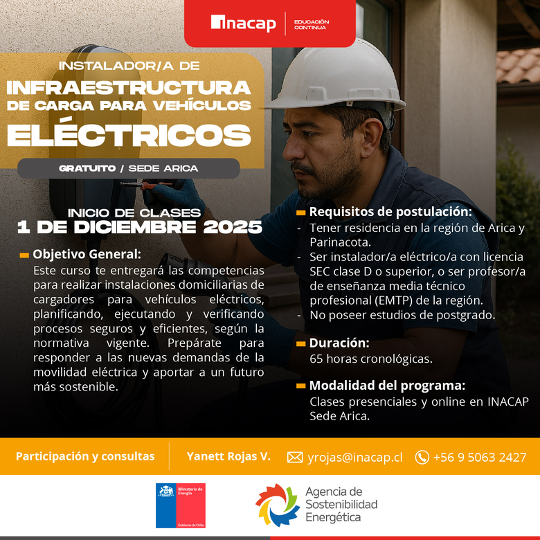 La Agencia de Sostenibilidad Energética (AgenciaSE) y el Instituto Profesional INACAP realizarán en la región de Arica y Parinacota el curso Instalador/a de Infraestructura de Carga para Vehículos Eléctricos, cuyas postulaciones se encontrarán abiertas hasta el 17 de noviembre.