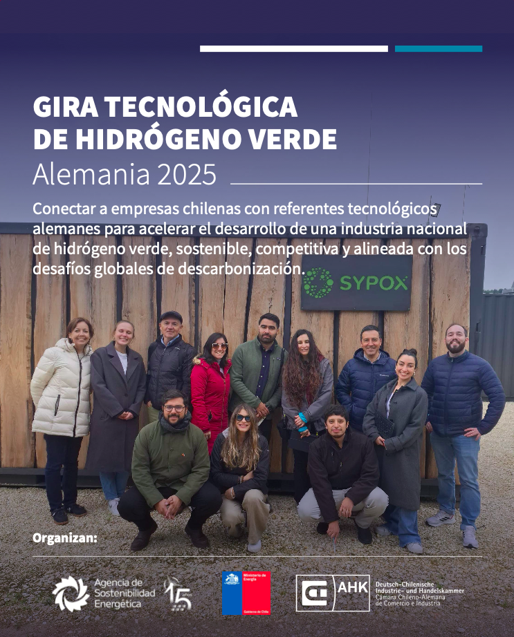 La gira organizada por AHK Chile reunió a 7 empresas chilenas y 9 representantes del ecosistema de hidrógeno verde en un recorrido por centros de innovación, ferias y compañías líderes del sector. Se visitaron startups y centros tecnológicos como SYPOX, Hydrogenious LOHC Technologies y el Energie Campus Nürnberg; se sostuvo una reunión con Invest in Bavaria y se participó en el Foro América Latina – Baviera 2025. Además, los participantes recorrieron la feria internacional Smarter E Europe, referente en energía solar, electromovilidad e hidrógeno, y conocieron la experiencia de Siemens en Wunsiedel, donde se desarrolla un sistema energético 100% renovable con planta de hidrógeno verde.